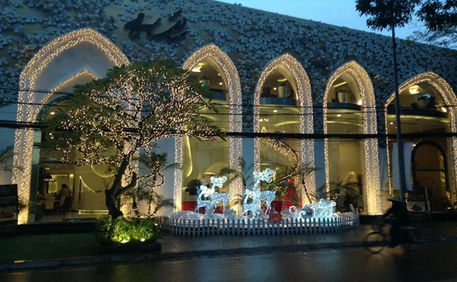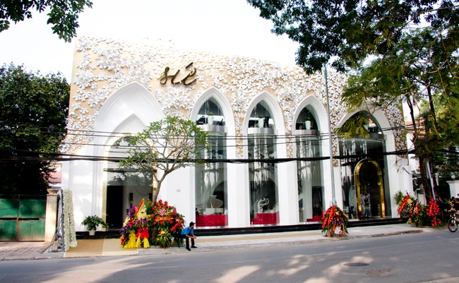 Những bức phù điêu hình hoa Sứ, những cánh cửa vòm cách điệu cánh hoa, những bức tường chạm trổ rừng hoa sứ tinh khôi và ngay cả những chiếc bánh được tạo hình hoa sứ…tất cả nổi bật trong sắc trắng tinh khiết giữa không gian trang trọng, rộng rãi và sự phối màu đen - trắng rất cổ điển của nghệ thuật kiến trúc.